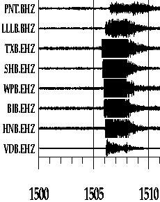 Each horizontal signal line (a "trace") represents the strength, or "amplitude", of the signal received at a single station over the period of an hour. The traces all begin and end at the same time, making it easy for the seismologist to see the difference in time between seismic events at several stations. Each station is part of the Canadian National Seismograph Network and has a unique identifier code of from 3 to 5 letters. For example, PNT is the station code for Penticton, BC. BIB is Bowen Island, BC. For the seismic plots there is a 3 letter code added to the station suffix code that tells the seismologist information about the characteristics of the seismograph signal. For example, ".BHZ" indicates a broadband, high gain seismograph that is oriented on the Z axis (which measures the "up and down" motion of the earth). The ".EHZ" code indicates an extremely shortperiod, high gain, Z axis seismograph. All of the signals on the displayed seismic plots have a Z axis orientation so that comparisons are easily made between seismograms. By looking at the time differences between the arrival of the same signal at several stations, and knowing how fast the signal is traveling through the earth's crust, trigonometry can be applied to determine the exact location of the earthquake.