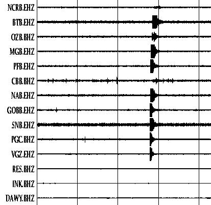 The sample set of signals on the right are those of a small local earthquake. You will notice that the left, or "leading" edge of each "burst" is very square. This indicates that the received signal became very strong in a very short time, which is typical for an earthquake signal. For these plots, the signal amplitude is so high that it reaches the maximum level and is "clipped" so that it looks like it has a flat top. After a while, the signal level begins to fall off as the earthquake energy dissipates gradually over time. Other bursts may appear shortly after the first arrival. These may be aftershocks or they may be other signals from the same earthquake that have travelled more slowly through the earth. There are 2 primary signal types, called S and P waves, and they travel in different ways and at different speeds. How do we know this is a small earthquake? Well, you will notice that the signal was not received on several stations that are farther away. The energy released by the earthquake was not strong enough to travel longer distances, so only those stations close by were able to detect it. You can also see that the signal reached some stations earlier than others. This information will be used to determine the earthquake location.