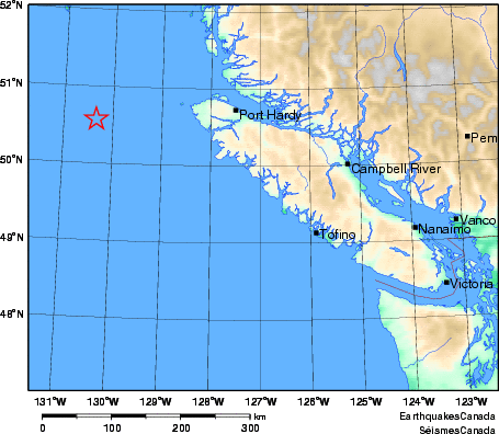 - One of an ongoing swarm of earthquakes offshore Vancouver Island. These events are too far offshore to be felt.