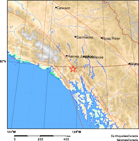 - Fortement ressenti à Whitehorse, Haines Junction, Atlin, Teslin, Carmacks, Watson Lake.